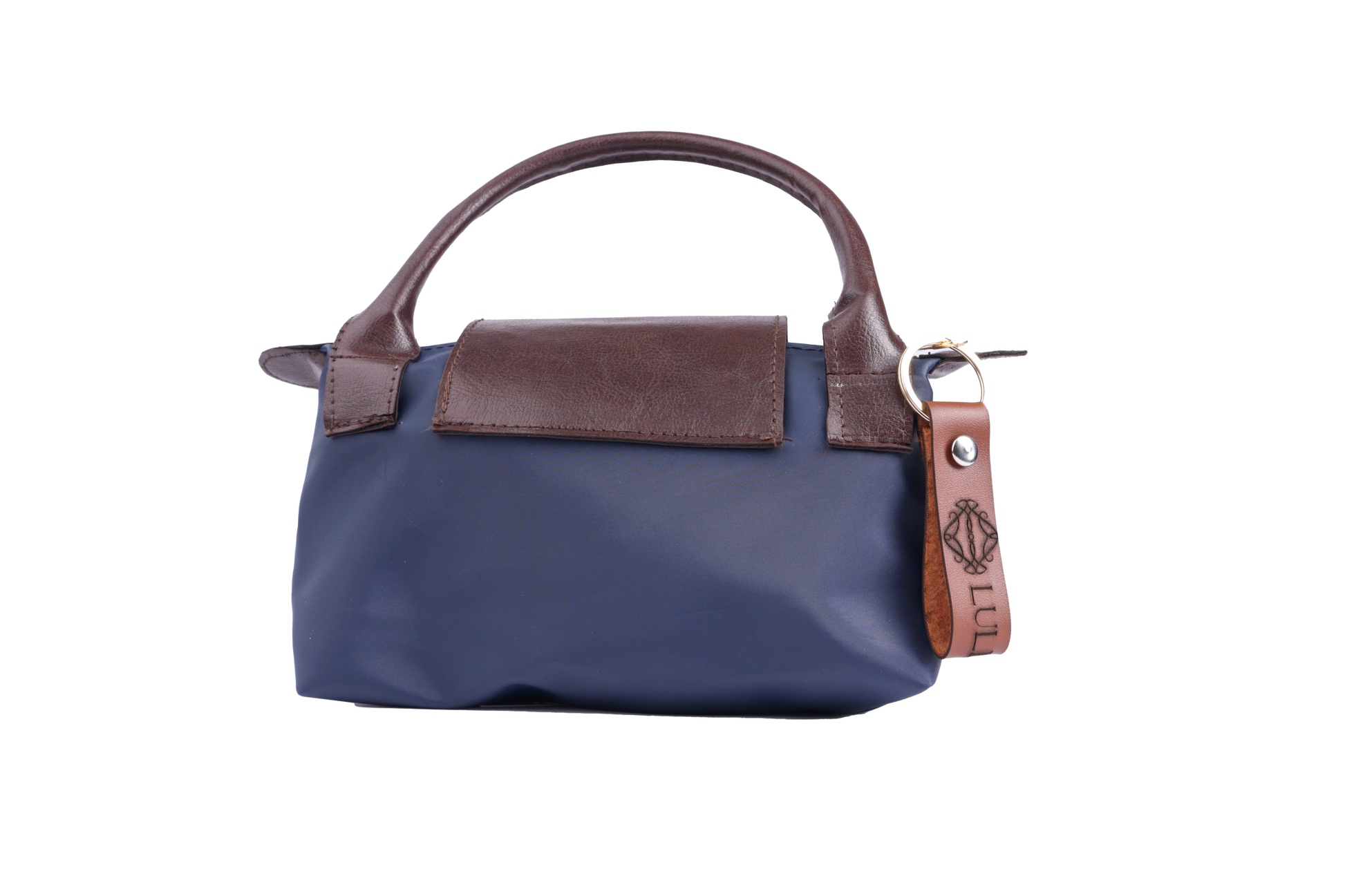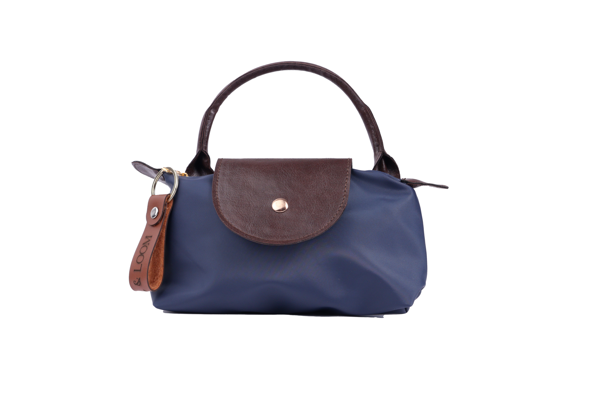 pouch with a leather-lined interior, secured by a zipper and snap closure.